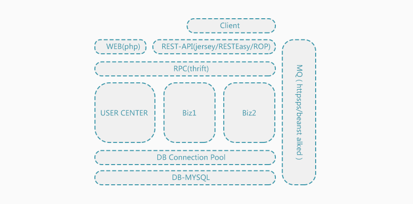 系統(tǒng)采用開放式API平臺,客戶端應(yīng)用通過 API 平臺與后臺業(yè)務(wù)處理服務(wù)通訊,所有業(yè)務(wù)處理與數(shù)據(jù)庫均放置在內(nèi)部網(wǎng)絡(luò),且各層級可以橫向擴展,整個架構(gòu)具備高可用性與高負載。